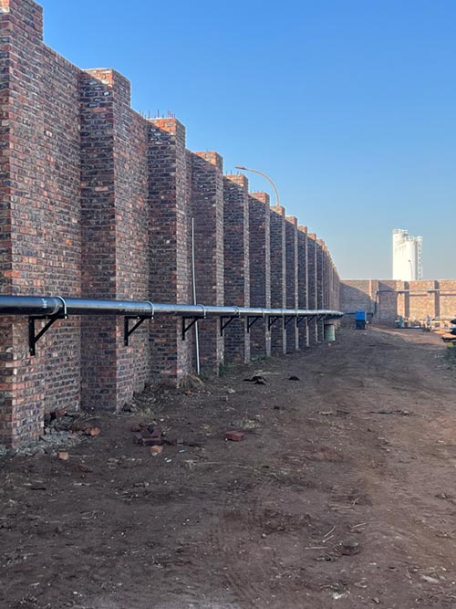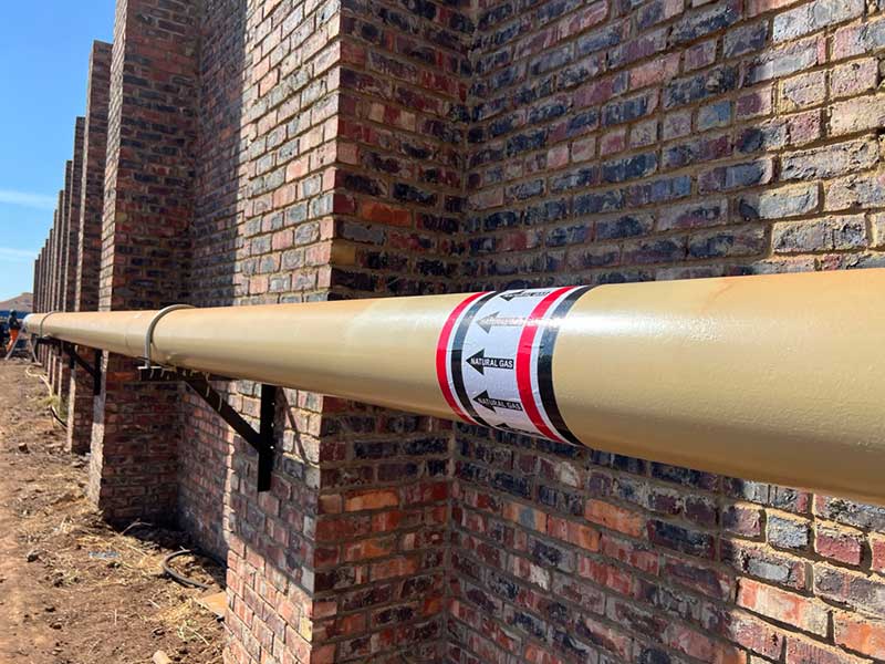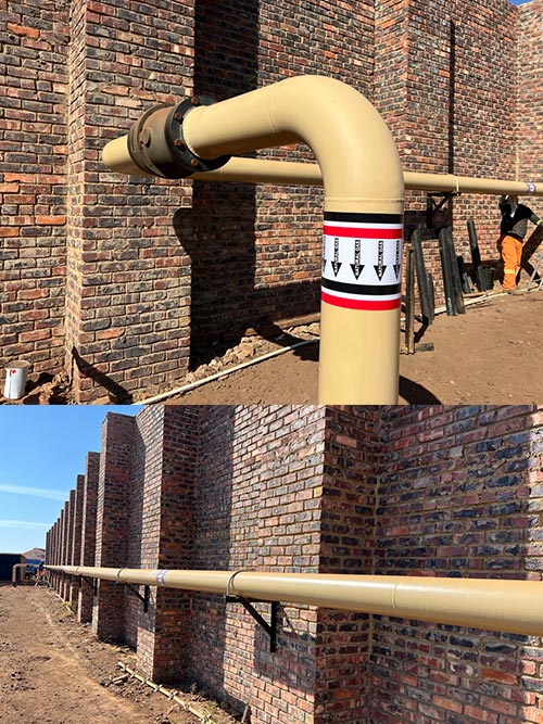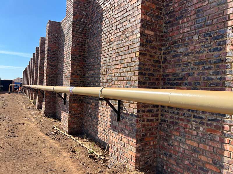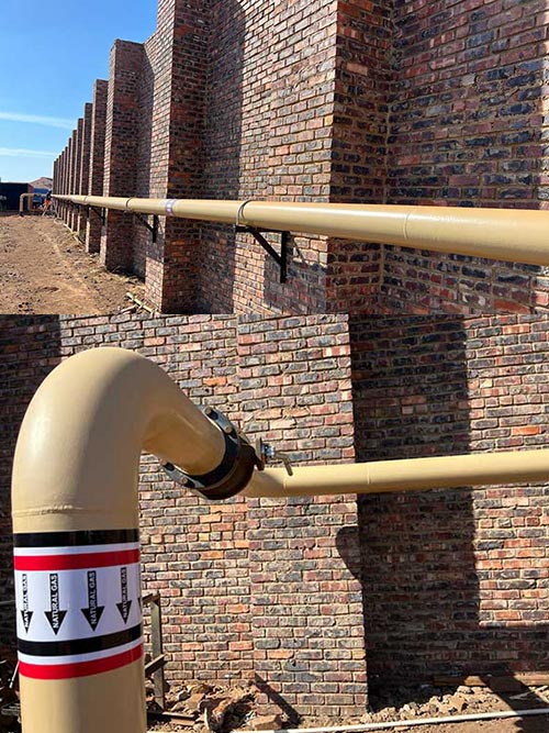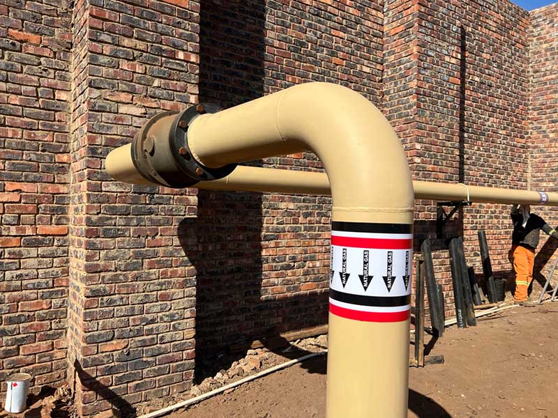 The internal gas line for Veer Aluminium was designed for a max operating pressure of 6 Bar. The main pipe size is 200mm effectively making this a Category 2 installation as per SANS 347. Ayogas employed a professional engineer, draughtsperson and an AIA on the project to adhere to the requirements of the Pressure Equipment Regulations and SANS 347. The category of installation also necessitated the use of coded welders, an AIA approved welding procedure and thorough weld maps and quality control. Phase 1 of the gas line has already been completed, pressure tested, signed off and a COC issued.